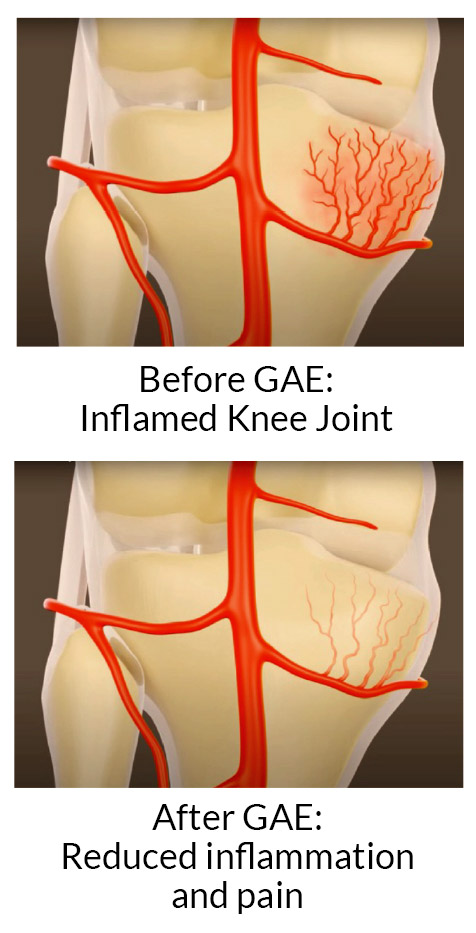 GAE is a targeted, image-guided procedure that reduces blood flow to areas of the knee that become inflamed in patients who suffer with osteoarthritis. These arteries—called genicular arteries—feed the inflamed synovial membrane surrounding the knee joint. By decreasing excessive blood flow, GAE: